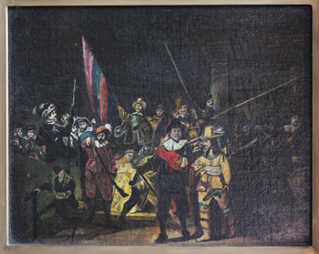 C. Lee Cook's “The Night Watch”, is not signed, and measures 10 1/2" by 8 1/4", much smaller than the original which is 11.91 ft × 14.34 ft. From the collection of Martin Davenport, grandson of Fred Durham, who took over ownership of the C. Lee Cook Corporation after the death of Mr. Cook.